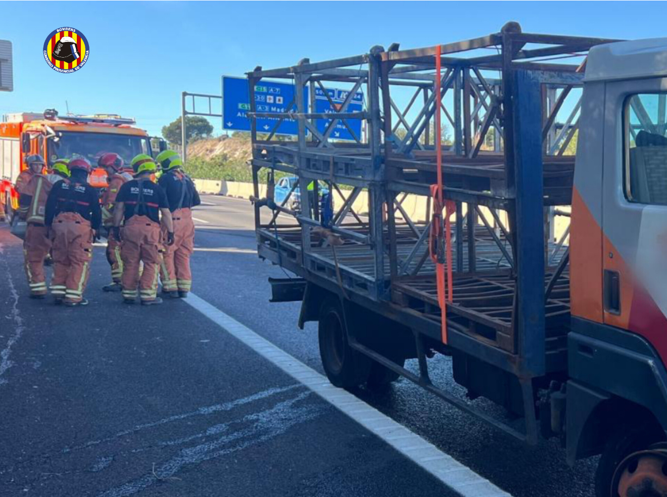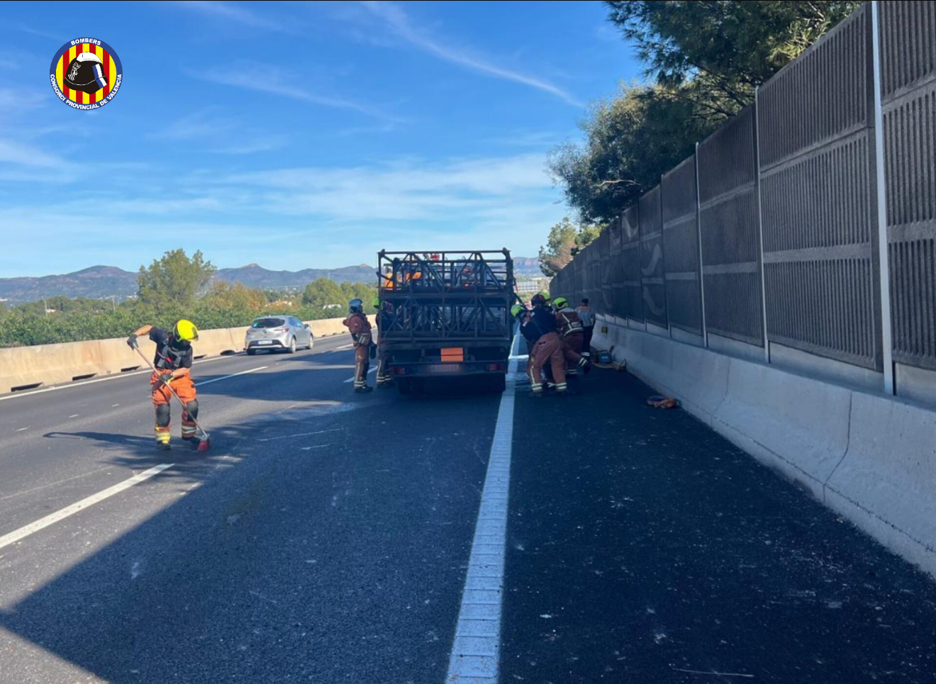 Efectivos del Consorcio Provincial de Bomberos de València han intervenido en un accidente de un camión que transportaba mercancías peligrosas en la A-7, a la altura de Godella, tras la reventada de una rueda del vehículo articulado.
