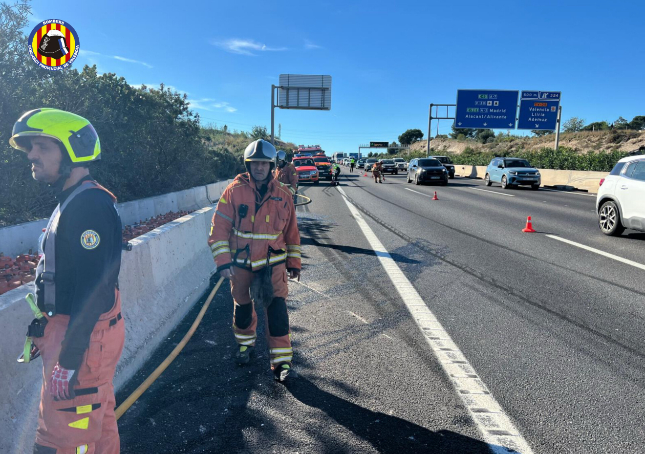 Accidente de un camión con mercancías peligrosas en la A-7 a su paso por Godella obliga a activar el plan especial