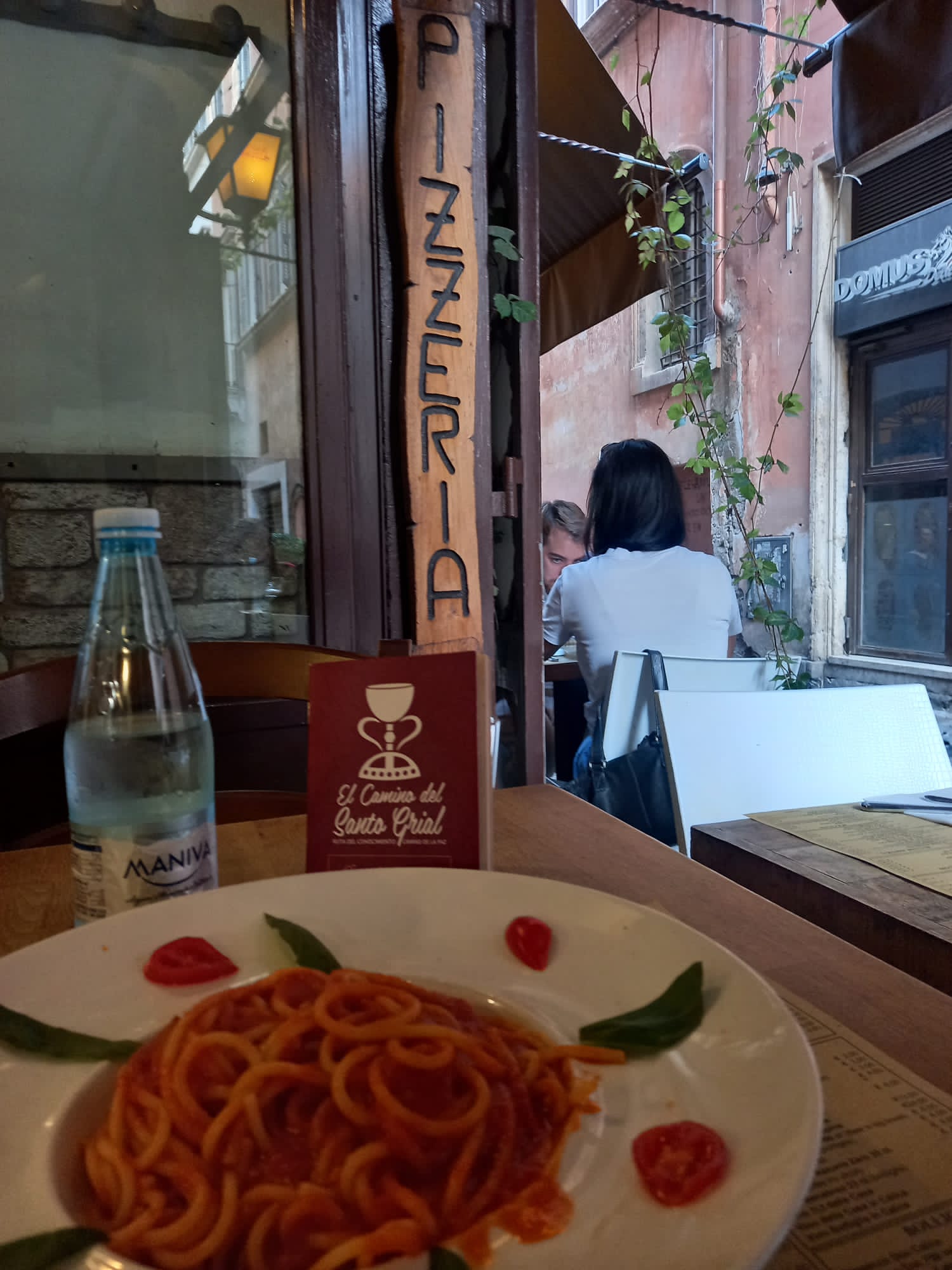 La Taverna Le Coppelle, conocida por su ambiente acogedor y su excelencia culinaria, ofreció a Alejandra una serie de platos cuidadosamente seleccionados reflejo de la rica herencia gastronómica de Roma. Todo ello gracias a mostrar a su llegada la Credencial de Peregrinación del Camino del Santo Grial.