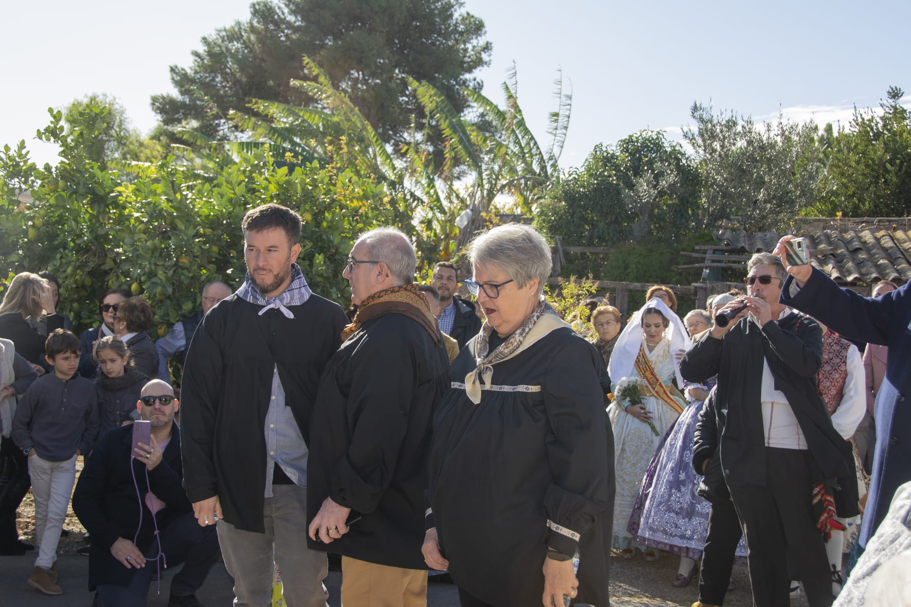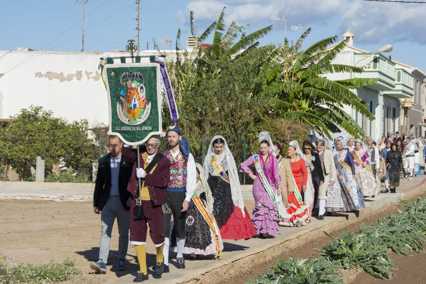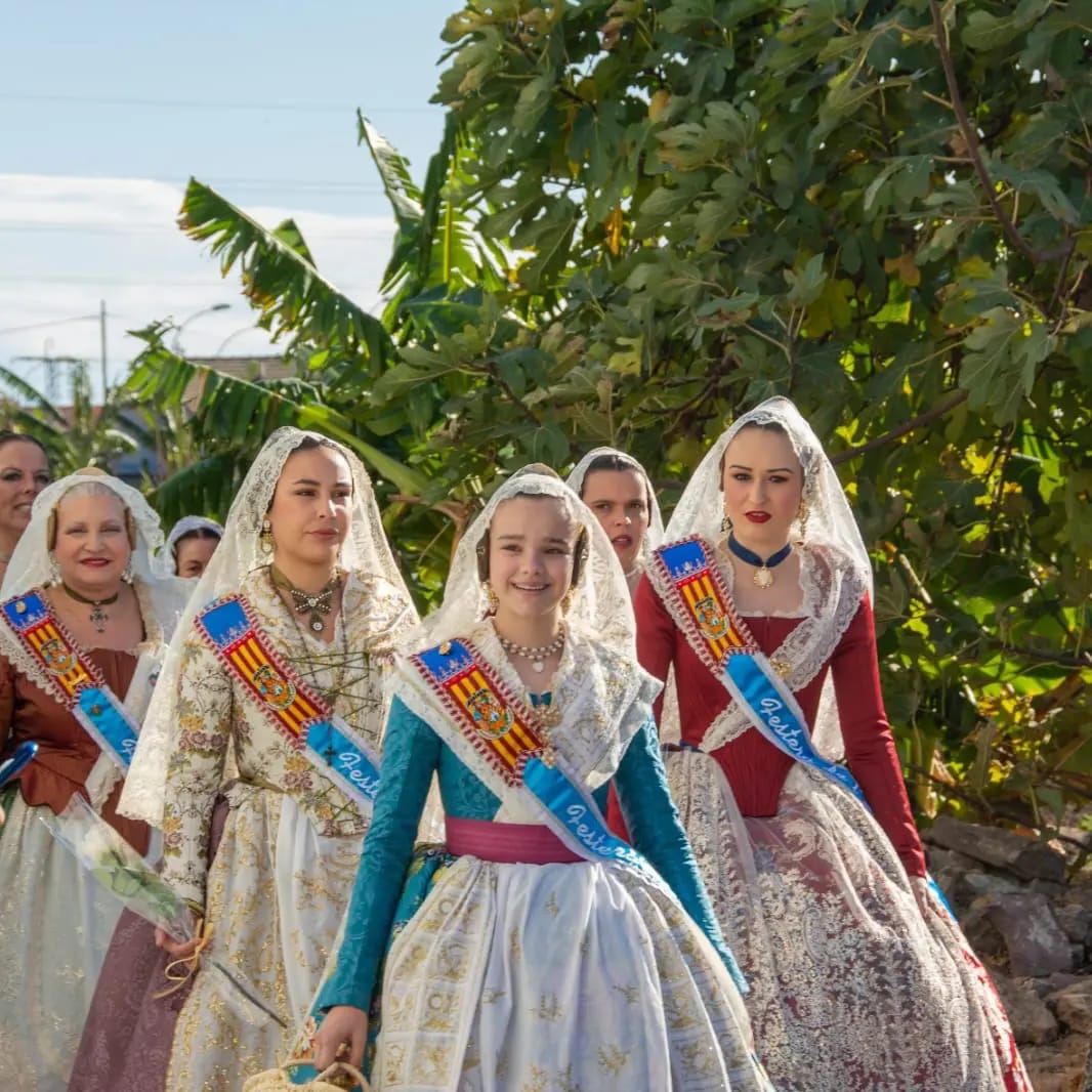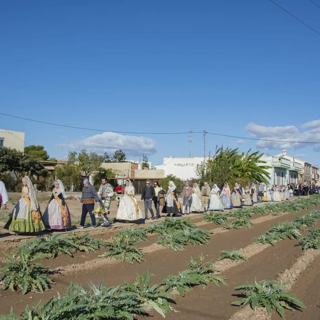 Bajo el brillante sol de la huerta, en comitiva acompañada por la armonía de la banda de música, el repique del tabal y la dulce melodía de la dolçaina, los participantes, engalanados con los trajes típicos regionales junto con la corte de honor de la huerta valenciana, se han adentrado por los caminos entre naranjos, huertos y alquerías centenarias hasta llegar a «Ca Cigaleta». Allí, con todos los honores, se ha recibido a la Reina de la huerta de Valéncia, Gloria Palau Iranzo, con típicas albaes, poesías y danzas valencianas.