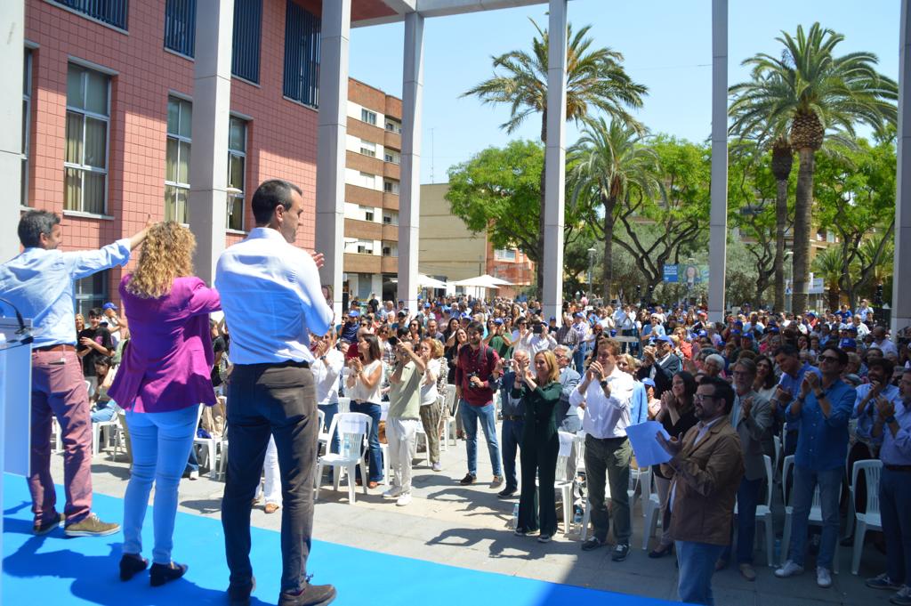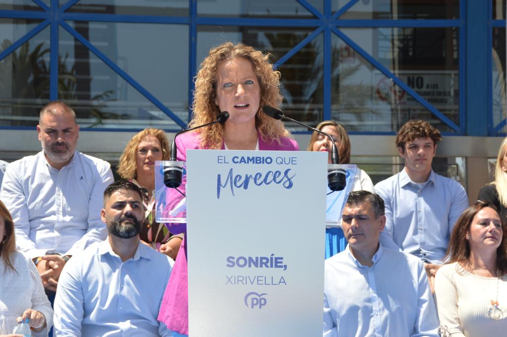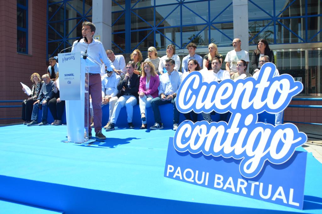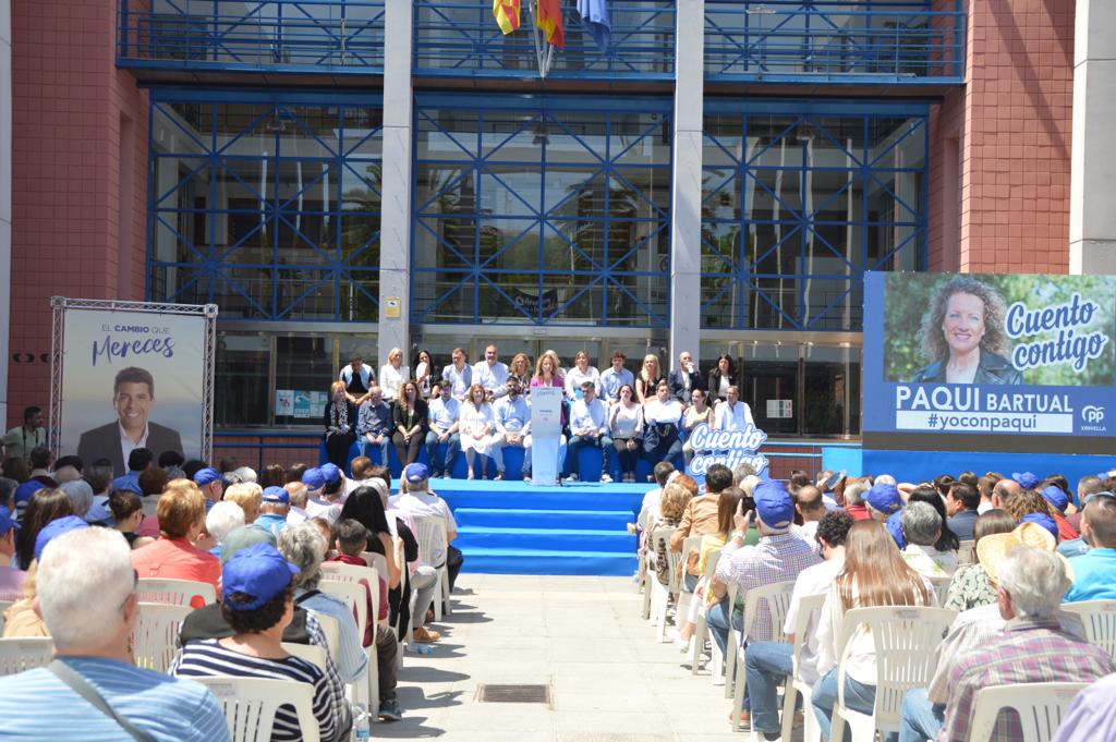 Paqui Bartual ha presentado su candidatura a la alcaldía de Xirivella ante una plaza del ayuntamiento abarrotada por casi 500 vecinos del municipio y con el apoyo del presidente regional, Carlos Mazón, y el presidente provincial, Vicente Mompó.