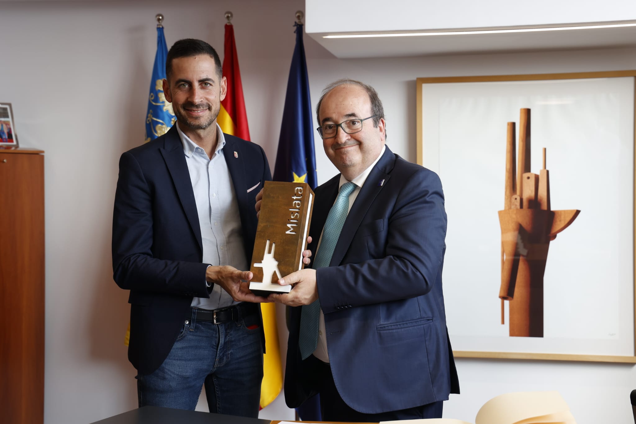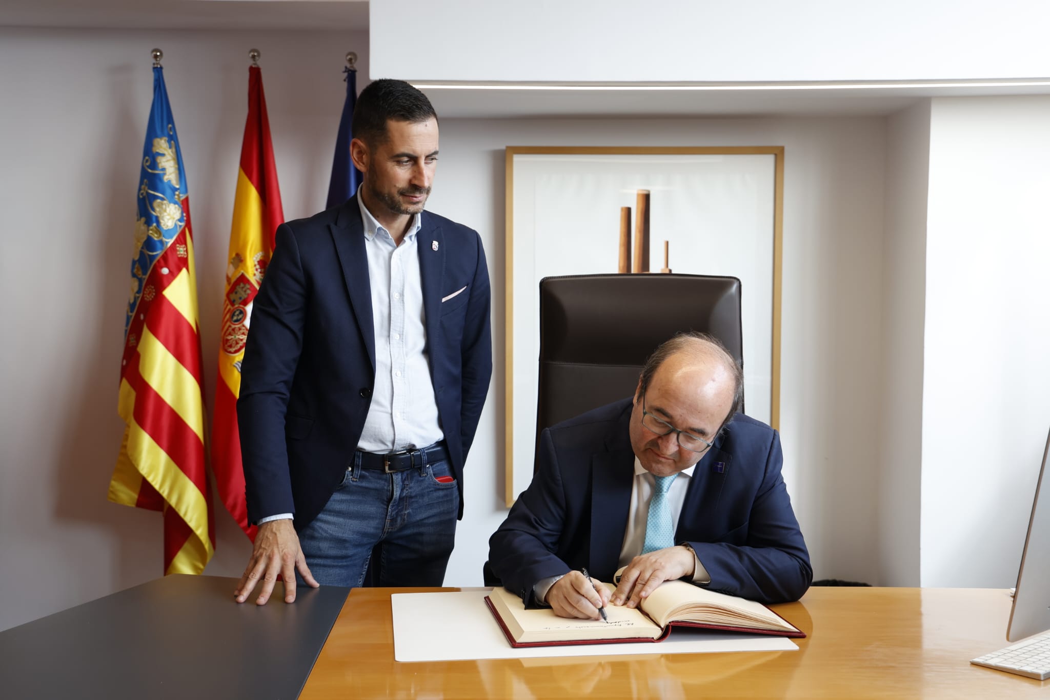 Mislata ha recibido esta tarde la visita del Ministro de Cultura, Miquel Iceta. El propio alcalde, Carlos F. Bielsa, y miembros del equipo de gobierno, le han dado la bienvenida a las puertas del consistorio, en la que es su primera visita a la ciudad. Por ese motivo, el titular de Cultura del Gobierno de España ha firmado también en el Libro de Honor.