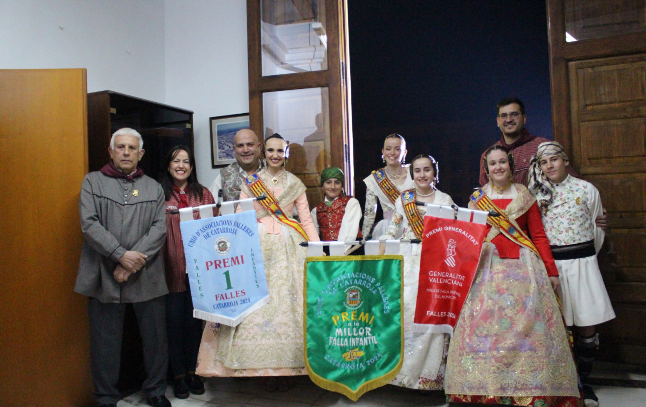 Les Falleres Majors de Catarroja, la xiqueta Itziar Tomás i la senyoreta Claudia Selma, acompanyades pel president infantil Juanvi Soler i el president de la UAFC, José López, al costat de l’alcaldessa Lorena Silvent i el regidor de Festes van ferde lliurament de les banderoles als quadres d’honor de les falles guanyadores d’enguany.
