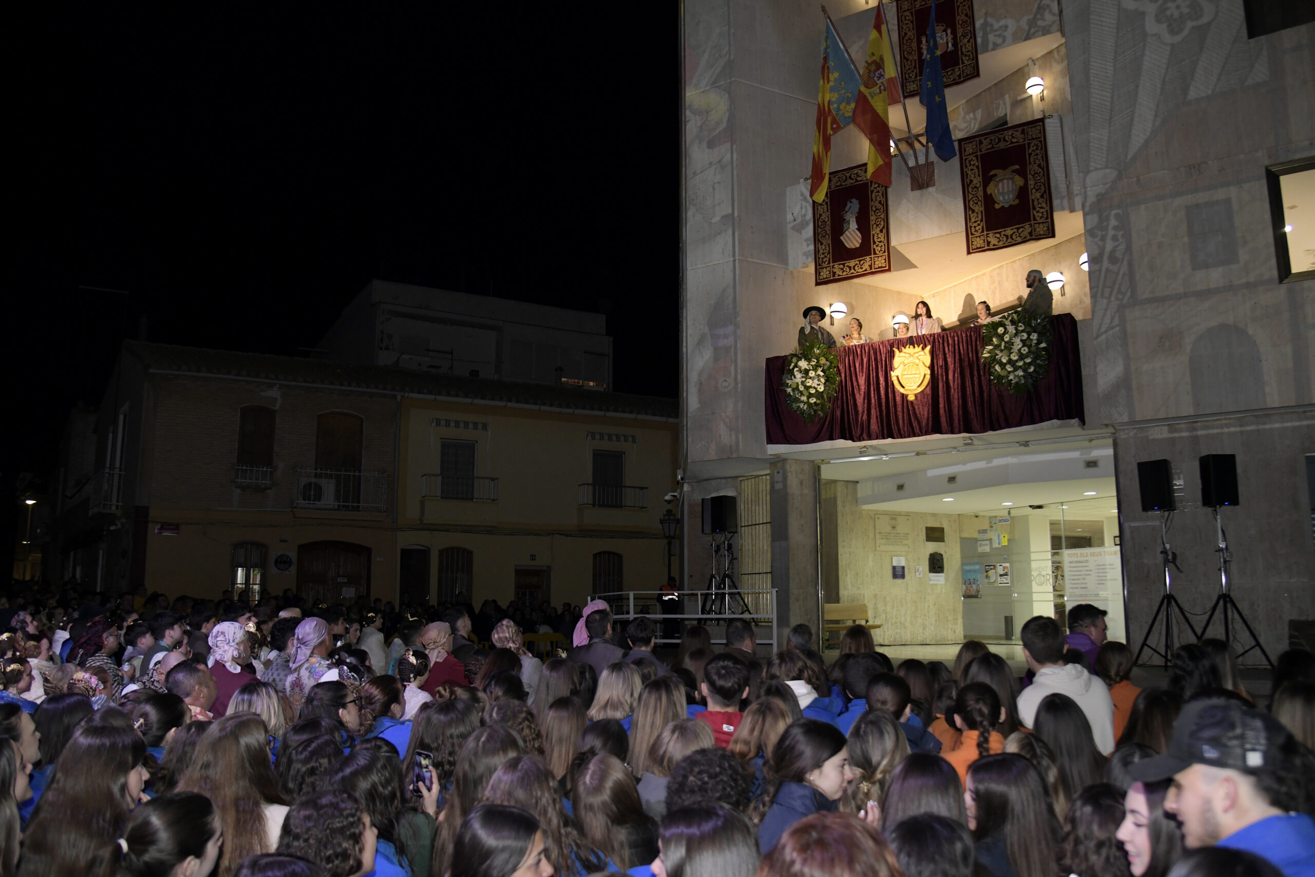 A l’acte va assistir la regidora de Cultura, Esther Torrijos, i el president de la Junta Local Fallera, Raúl Zamora Jurado al costat de les falleres per a donar principi a estes festes i veure, al costat de tota la població, la projecció de l’impressionant videomapping sobre la façana de l’ajuntament.