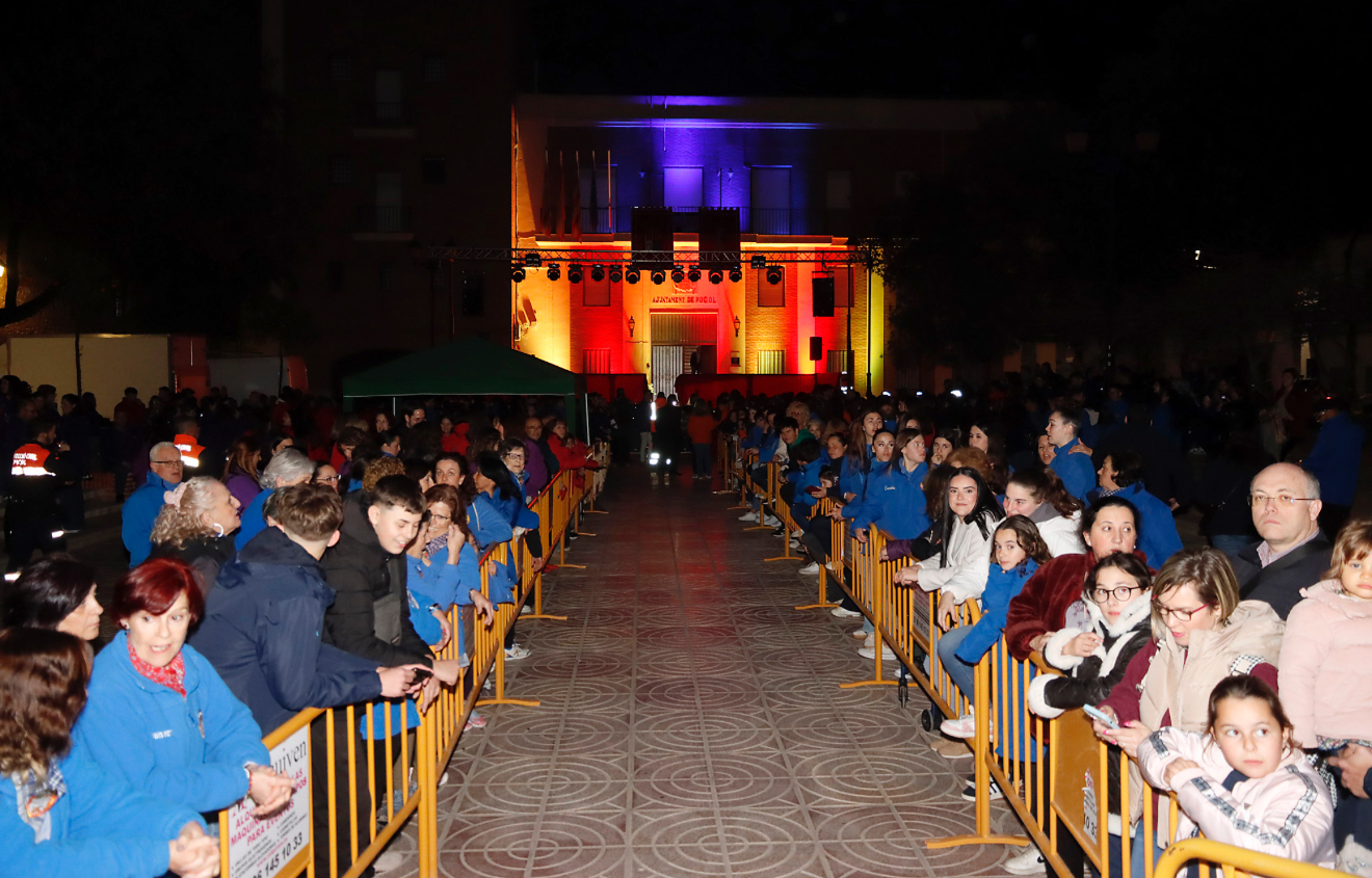 Una vez en la plaza, llamaba la atención la iluminación de la fachada del Ayuntamiento, con los colores rojo, amarillo y azul. Y el público, porque en los actos falleros siempre hay muchos asistentes. Todo preparado para el inicio de las fiestas… excepto un invitado al que nunca se llama, pero aparece ocasionalmente: la lluvia.