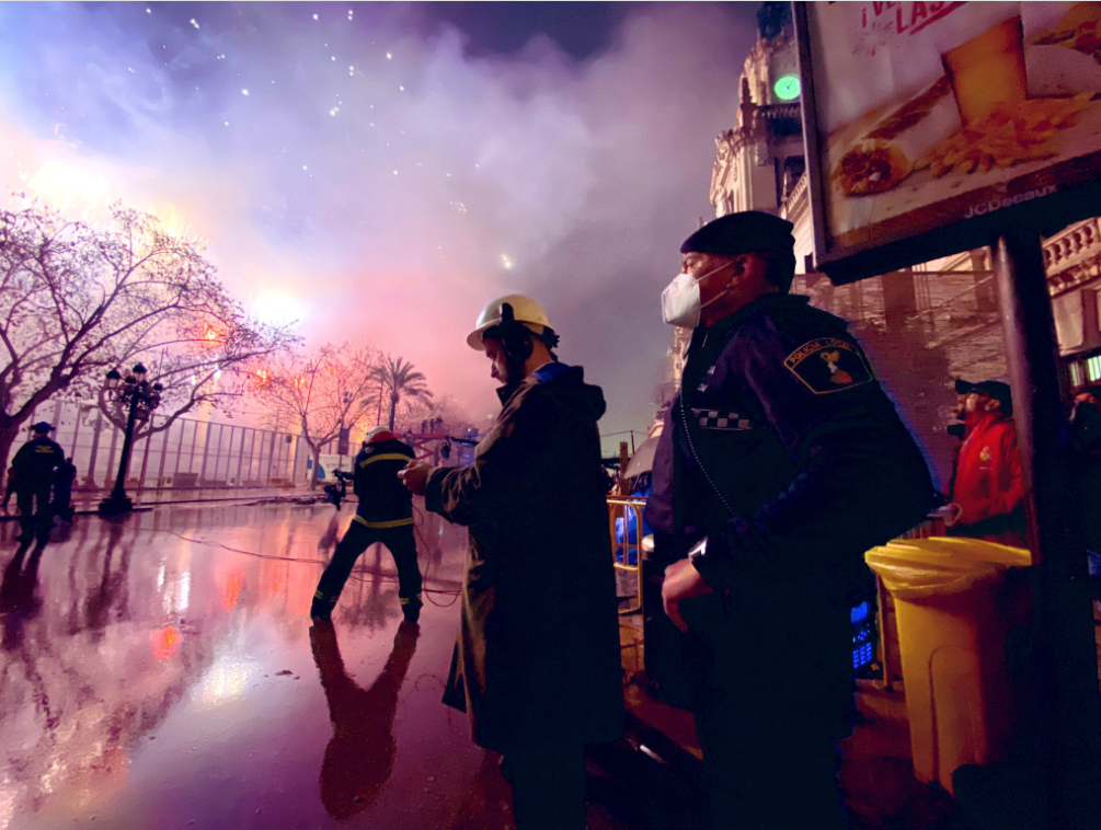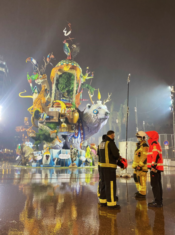 La Cremà está siendo vigilada y atendida por un dispositivo reforzado de bomberos que presta atención especial a los efectos del viento para evitar daños en fachadas o mobiliario urbano.