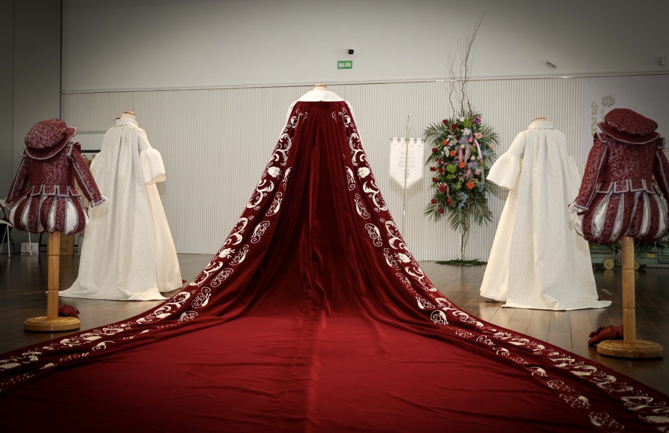 Si hay una pieza que concentra todas las miradas es la capa. Con una longitud de siete metros, está confeccionada en terciopelo de algodón y bordada con hilo de plata, convirtiéndose en el elemento más imponente del conjunto.