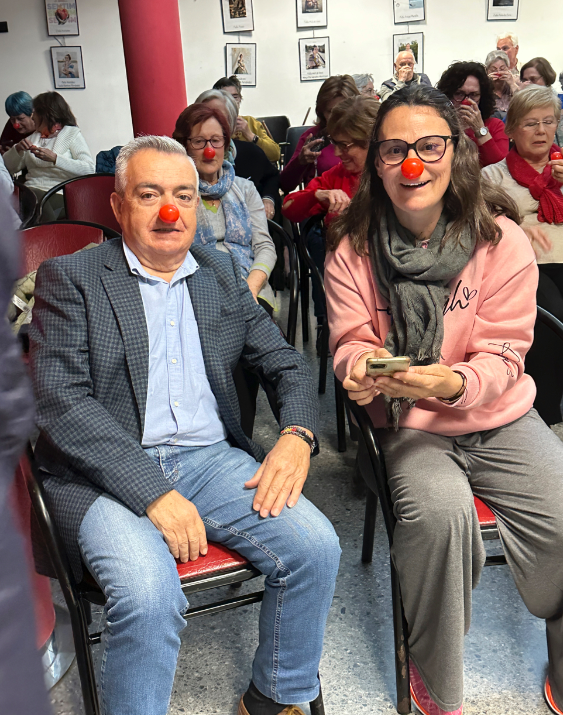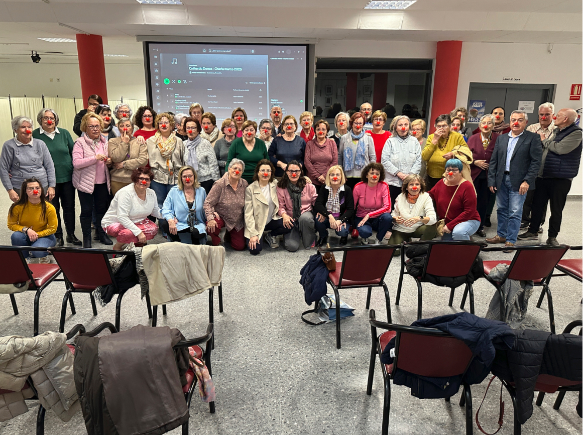 El Col·lectiu de Dones se sumó al Mes de la Mujer con un taller interactivo que estaba previsto el martes 4 de marzo, pero que se retrasó por la lluvia y, finalmente, se celebró el viernes 27, el último día. Una feliz coincidencia porque fue un acto no solo muy divertido, también saludable, con amplia participación… y un público entregado a Javier Navarro, que consiguió que toda acabaran posando con una nariz de payaso.