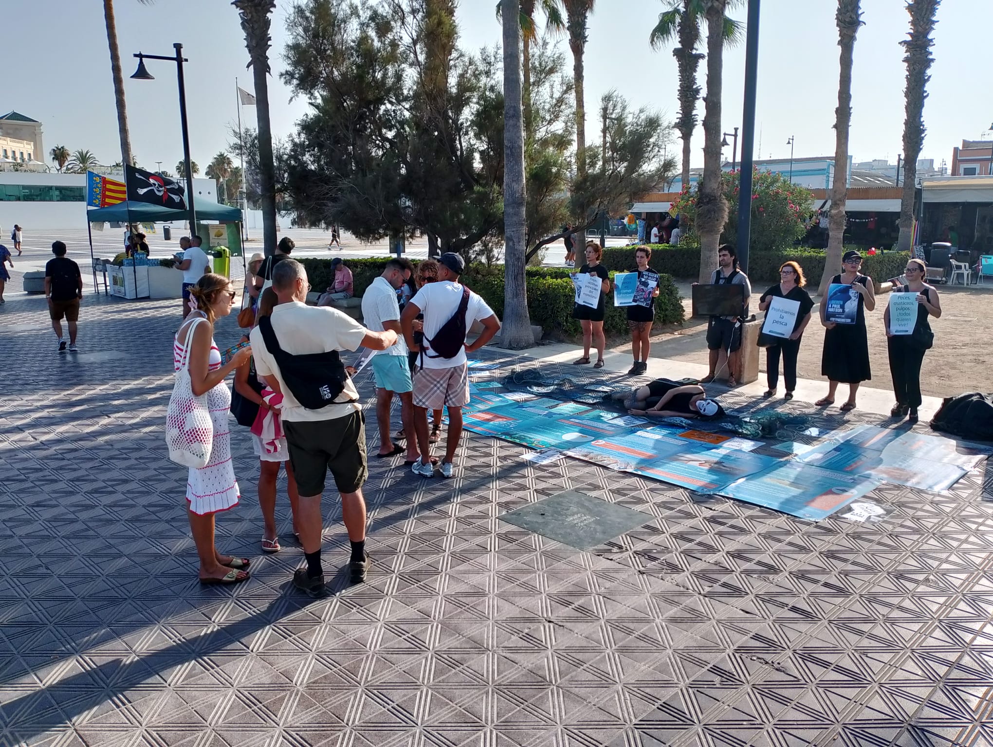 El activismo por la defensa de los animales no cesa tampoco durante el verano y por ello, activistas del colectivo antiespecista València Animal Save han realizado una llamativa performance por la defensa de todos los animales acuáticos en el paseo marítimo.