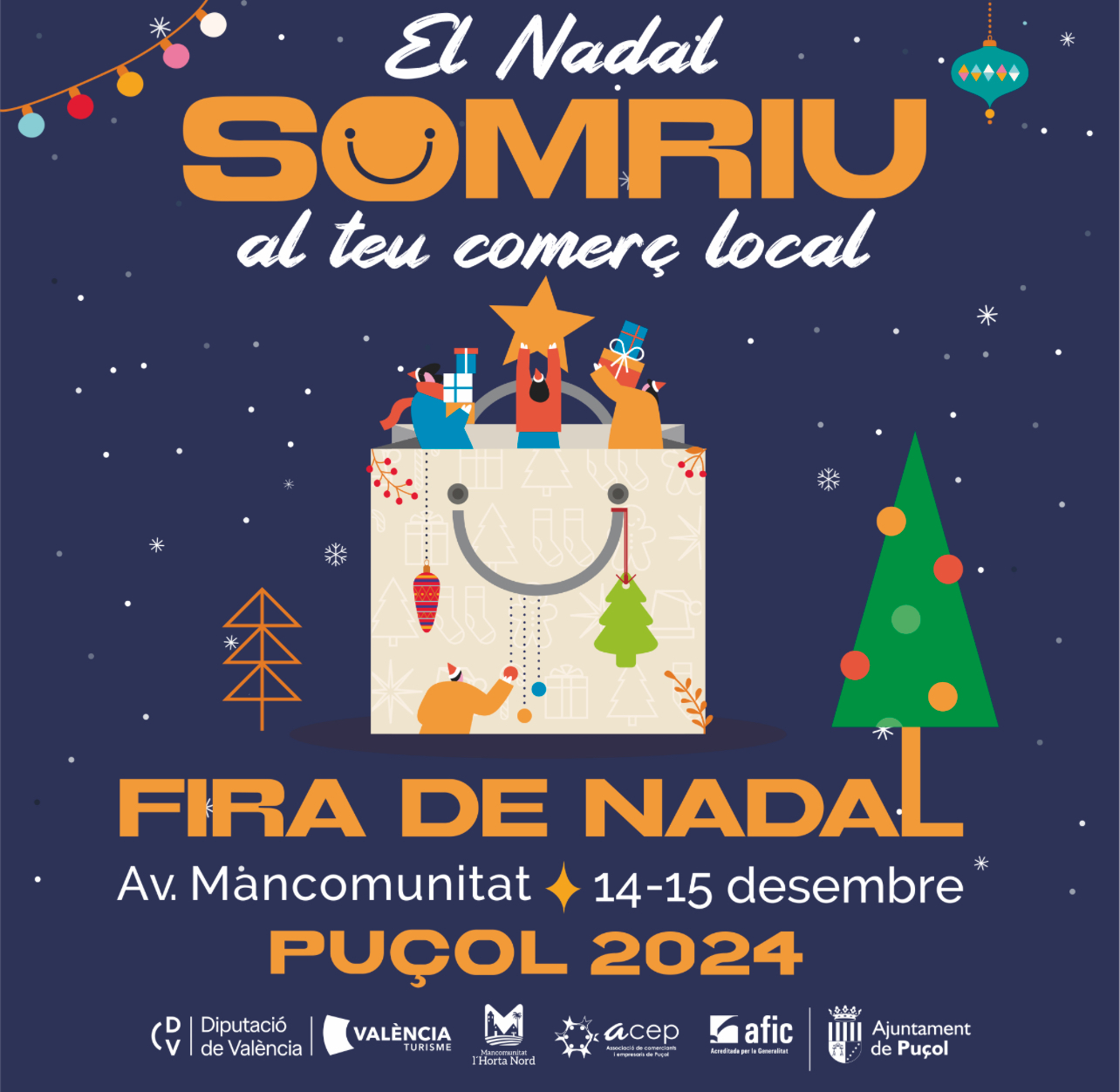 Los días 14 y 15 de diciembre, en la avenida Mancomunitat de l’Horta Nord, se celebra una nueva edición de la Feria de Navidad, organizada por el Ayuntamiento de Puçol con el apoyo de ACEP (Asocaición de Comerciantes y Empresarios), la Diputación de Valencia, la Mancomunitat de l’Horta Nord y AFIC (Agencia para el Fomento de la Innovación Comercial).
