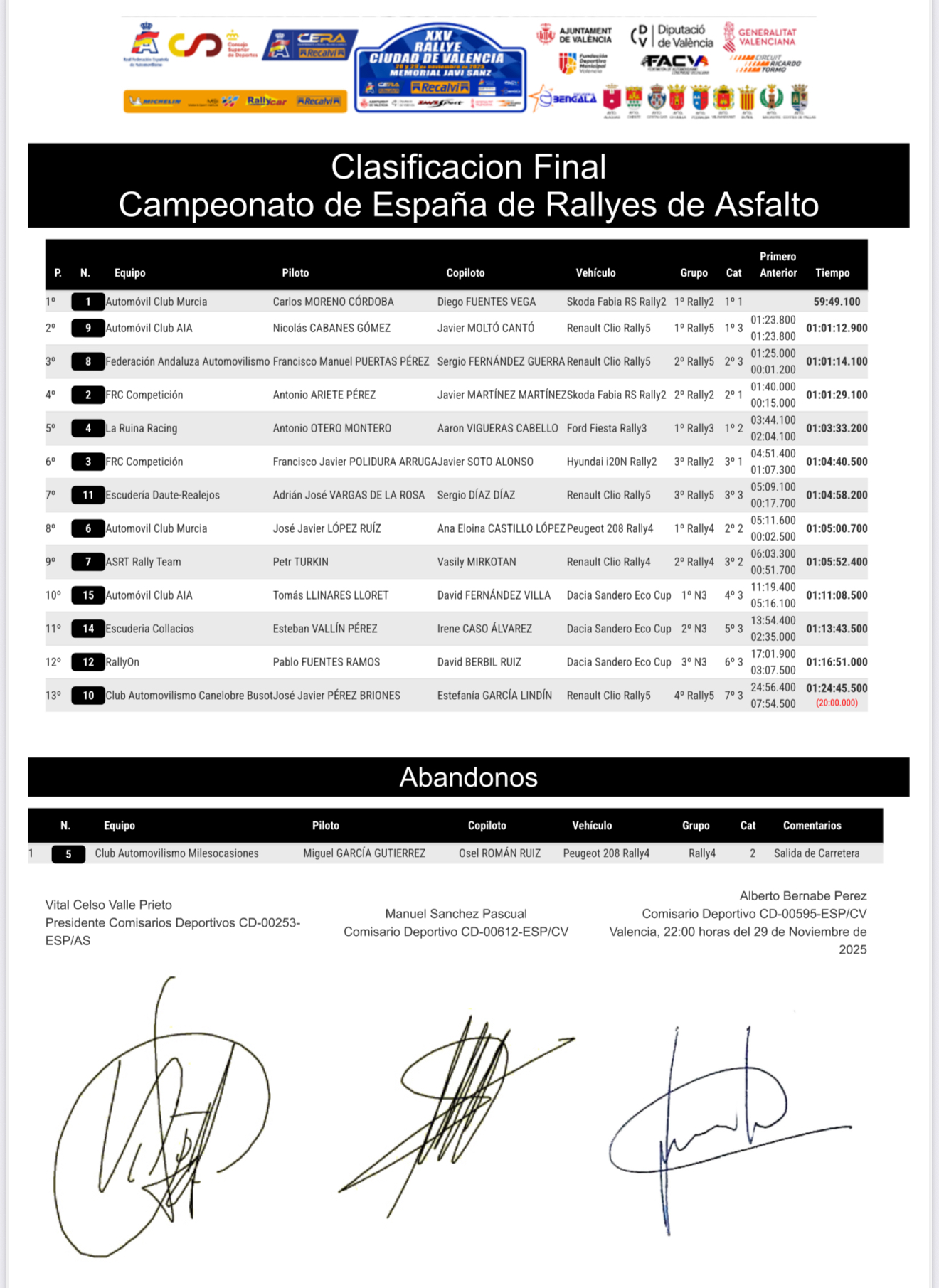 En esta edició, Carlos Moreno i Diego Fuentes es van proclamar campions absoluts, mentre que Vicente Cabanes i Javi Moltó van aconseguir la segona posició i es van adjudicar la Clio Trophy Asfalt 2025. D’altra banda, la parella formada per Esteban Vallín i Irene Caso va ser la guanyadora de la Dacia Sandero Eco Cup 2025.