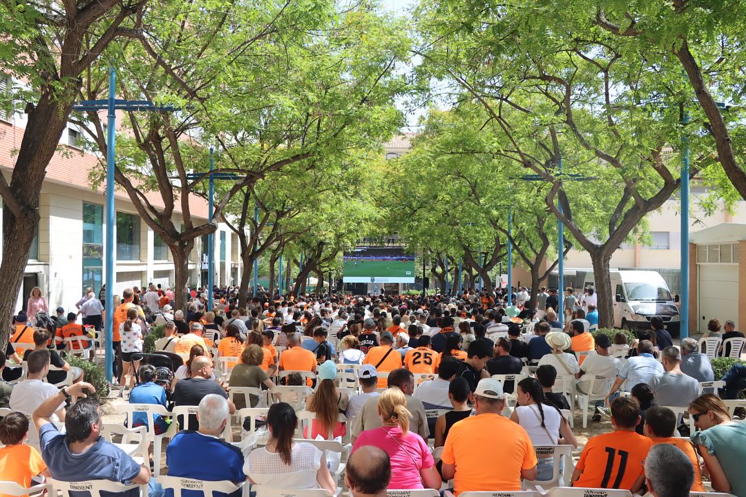 El Ayuntamiento de Torrent, a través de la delegación de Deportes que dirige Mª Ángeles Lerma, organizó una gran pantalla para que los más de 1.500 aficionados pudieran vivir juntos el partido. La alcaldesa de Torrent, Amparo Folgado, no quiso perderse este momento y estuvo presente junto a la afición animando al equipo durante los 120 minutos de encuentro. La marea naranja llenó de color y ambiente festivo la calle Mestre Fuertes Julvez, acompañando un DJ y speaker, demostrando una vez más la gran pasión que despierta el fútbol en Torrent
