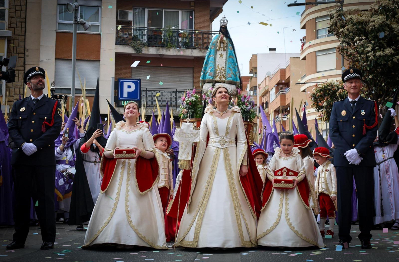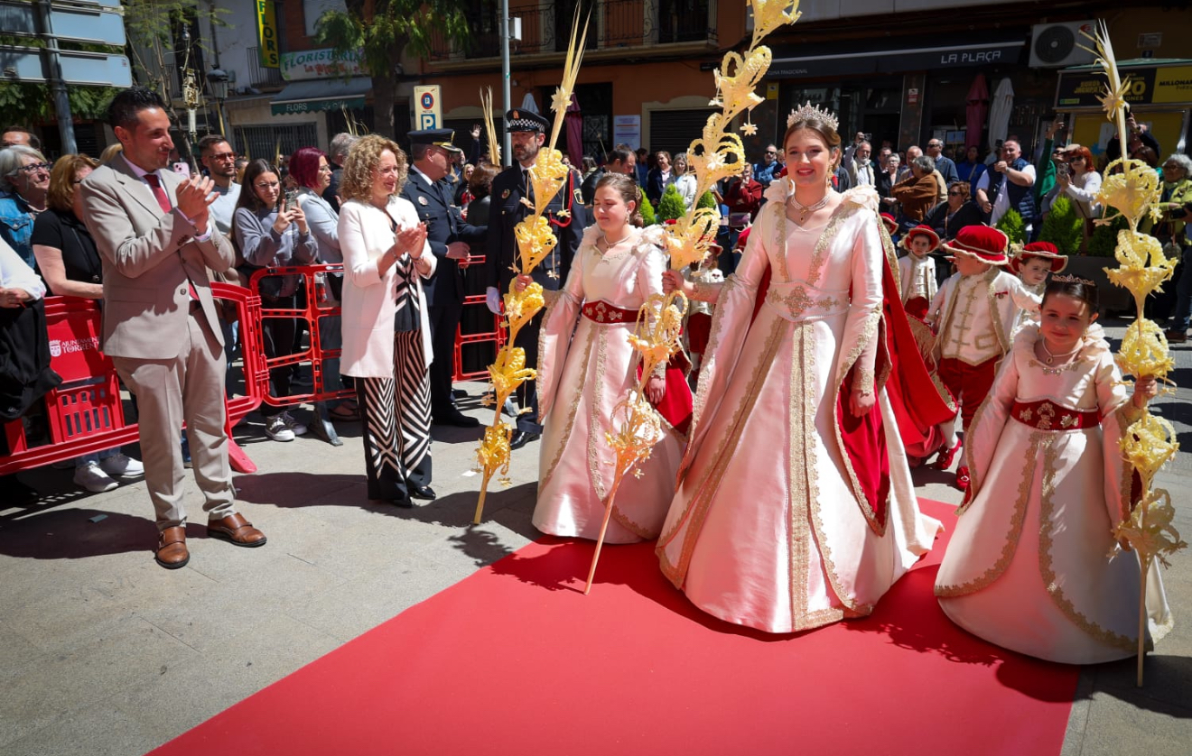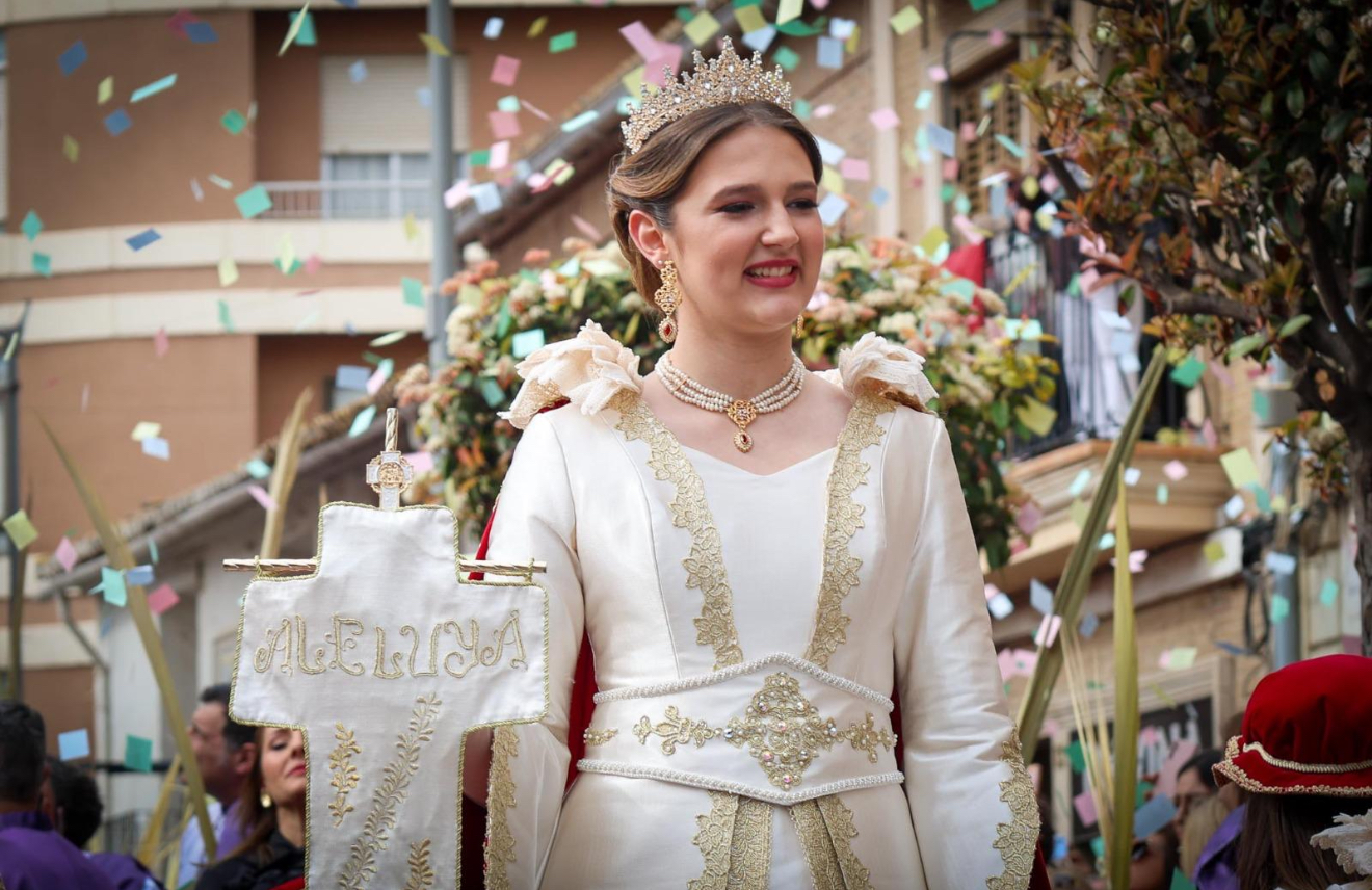 El momento culminante del Encuentro Glorioso ha tenido lugar cuando ambas procesiones se han encontrado en la Plaza Mayor. Allí, Lucía Mora Santandreu, la Reina del Encuentro, ha sido la encargada de anunciar la Resurrección de Cristo y proclamar la esperada “Alegría, alegría, alegría”. Acompañada por sus camareras, Alejandra Andreu Carratalà e Irene del Molino Chirivella, y sus 14 pajes, Lucía Mora Santandreu.