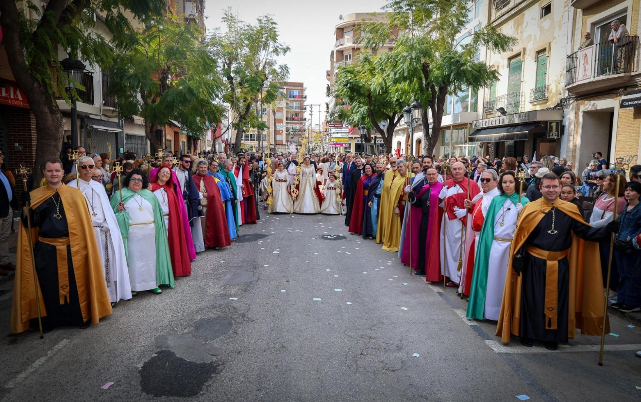 Tras el encuentro en la Plaza Mayor, todas las hermandades han continuado su desfile por la calle de la Iglesia, camino a la Parroquia de la Asunción de Nuestra Señora, donde se ha celebrado la Eucaristía, también retransmitida en À Punt.
