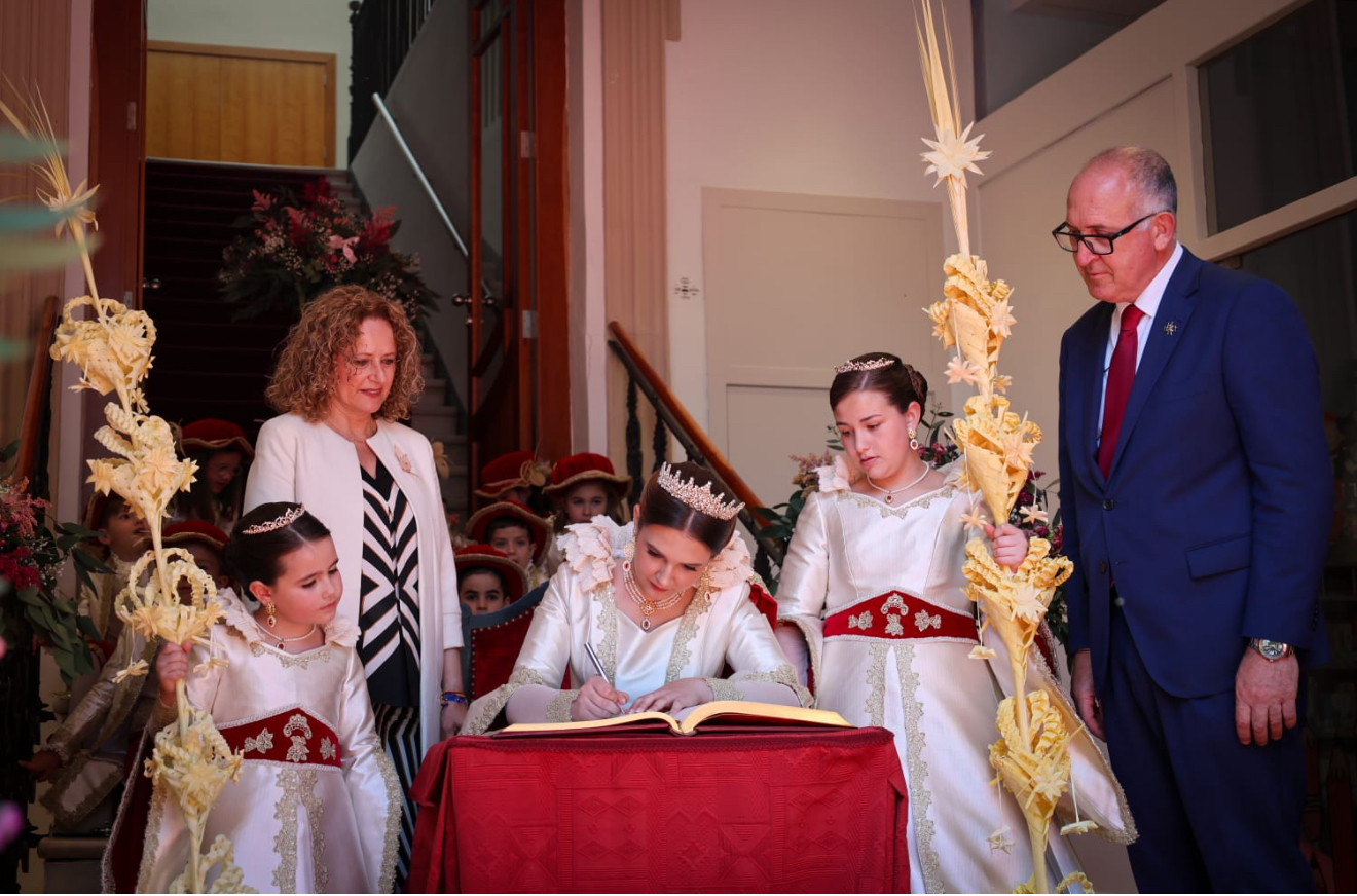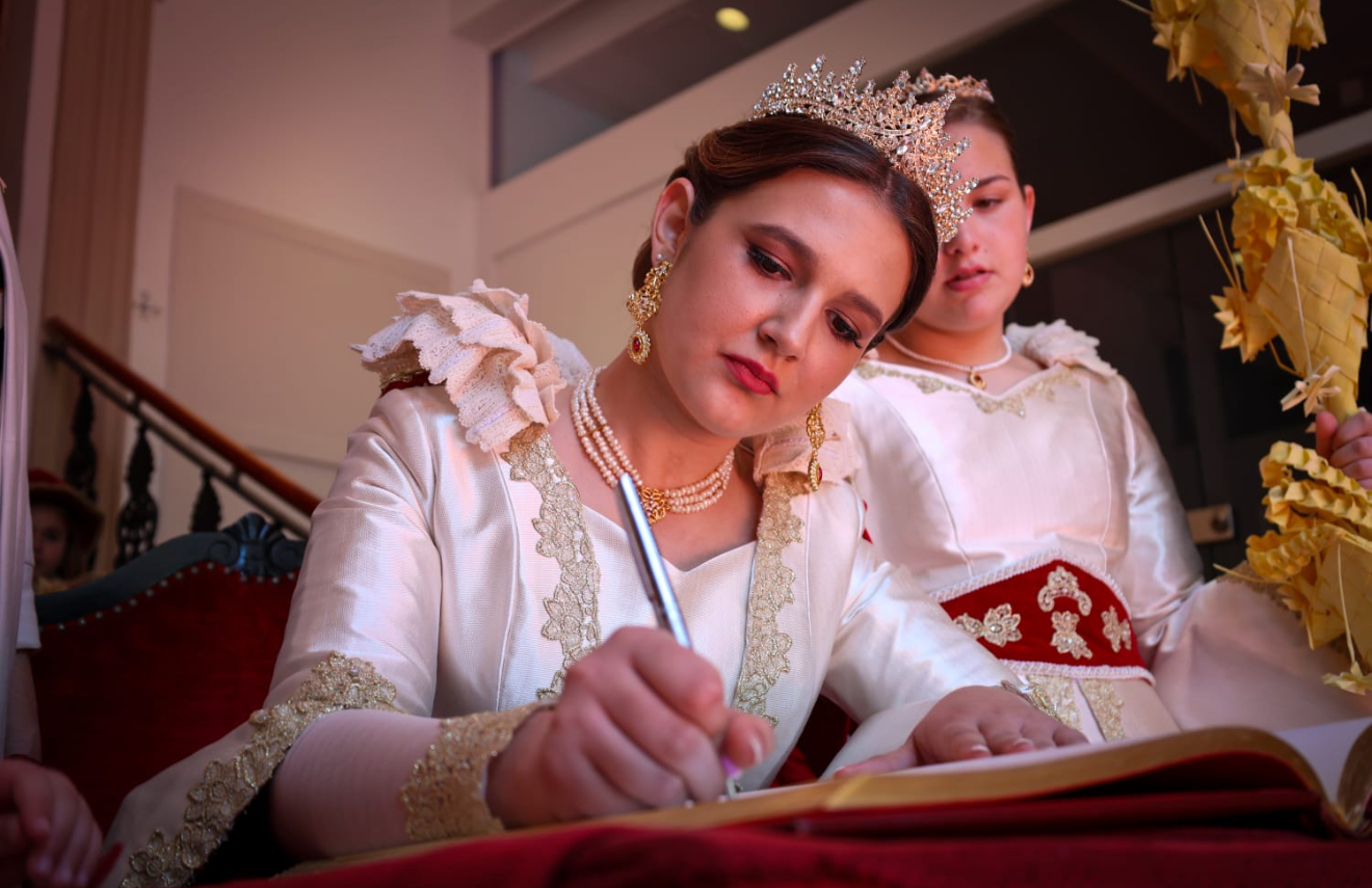 Al finalizar la misa, las hermandades, encabezadas por la Reina del Encuentro y la Hermandad de Nuestra Señora de los Dolores, la Soledad y la Resurrección, han acompañado a la Virgen hasta su parroquia, donde Lucía Mora Santandreu ha realizado una emotiva acción de gracias ante la imagen de la Virgen. Un gesto de devoción que ha culminado con la firma de Lucía Mora Santandreu en el Libro de Honor del Ayuntamiento de Torrent, un acto que, como el año pasado, se ha llevado a cabo en el hall de la Casa de la Cultura, para mayor comodidad de la Reina, que porta una capa de más de 6 metros y de los asistentes.