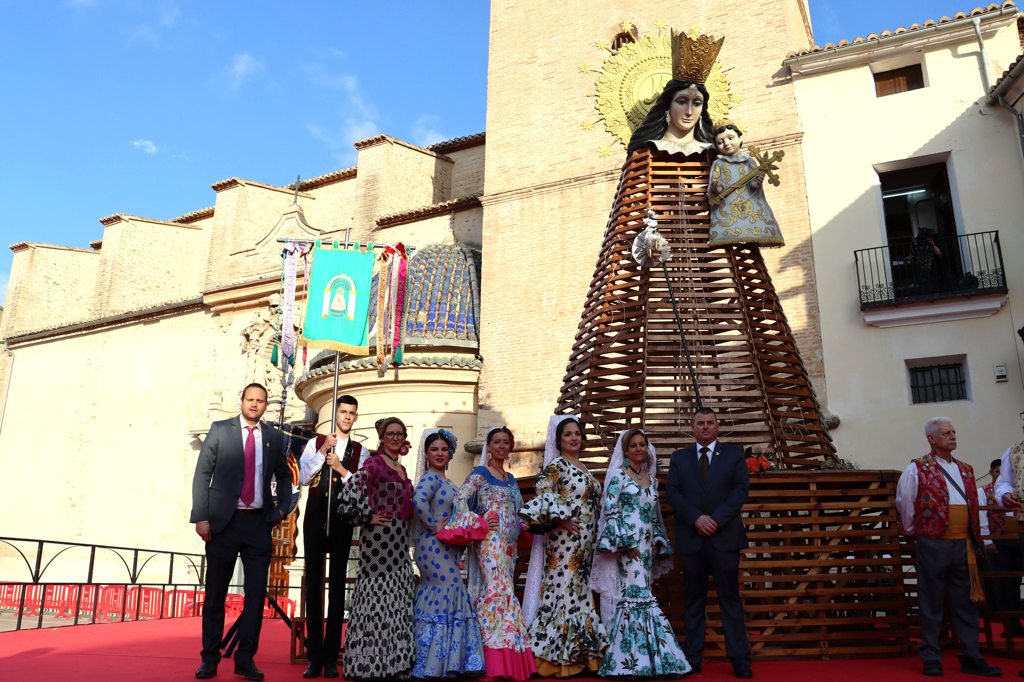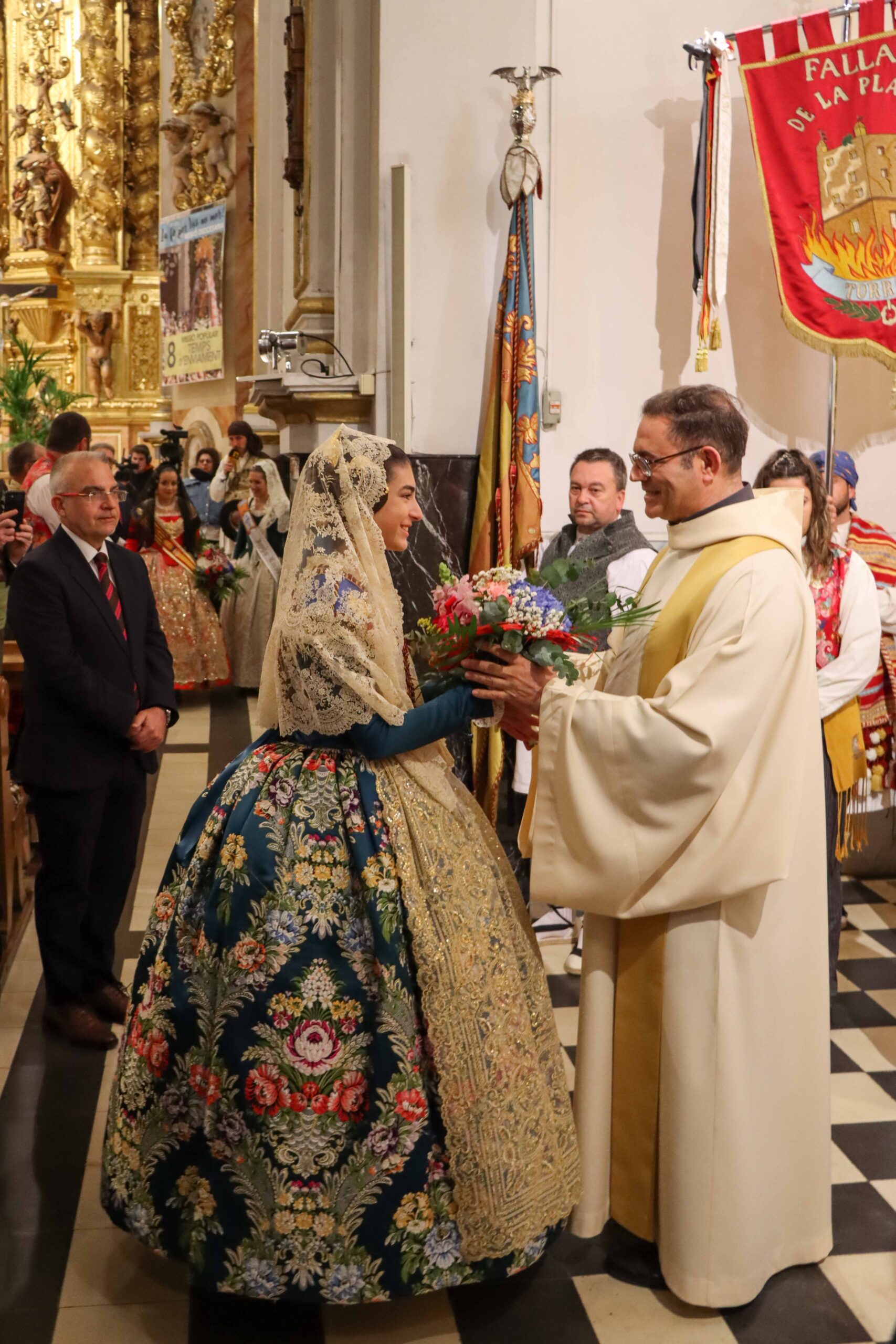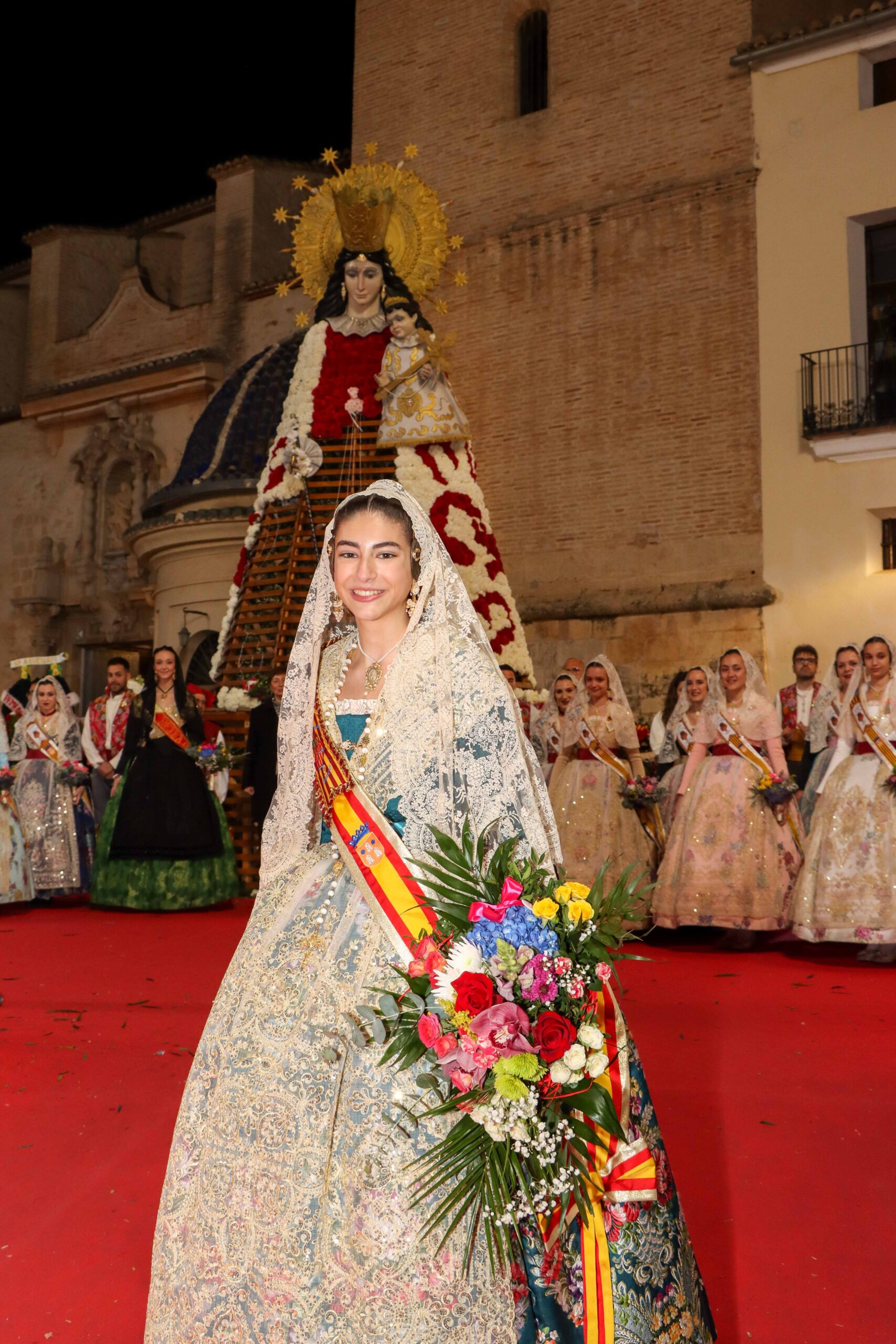 Las Fallas de Torrent desfilan ante la Virgen de los Desamparados, patrona de la ciudad, para hacerle entrega de las flores que conformarán el manto que se completará hoy gracias a la ofrenda de los falleros que celebran hoy la Ofrenda y a los vestidores de la Virgen.