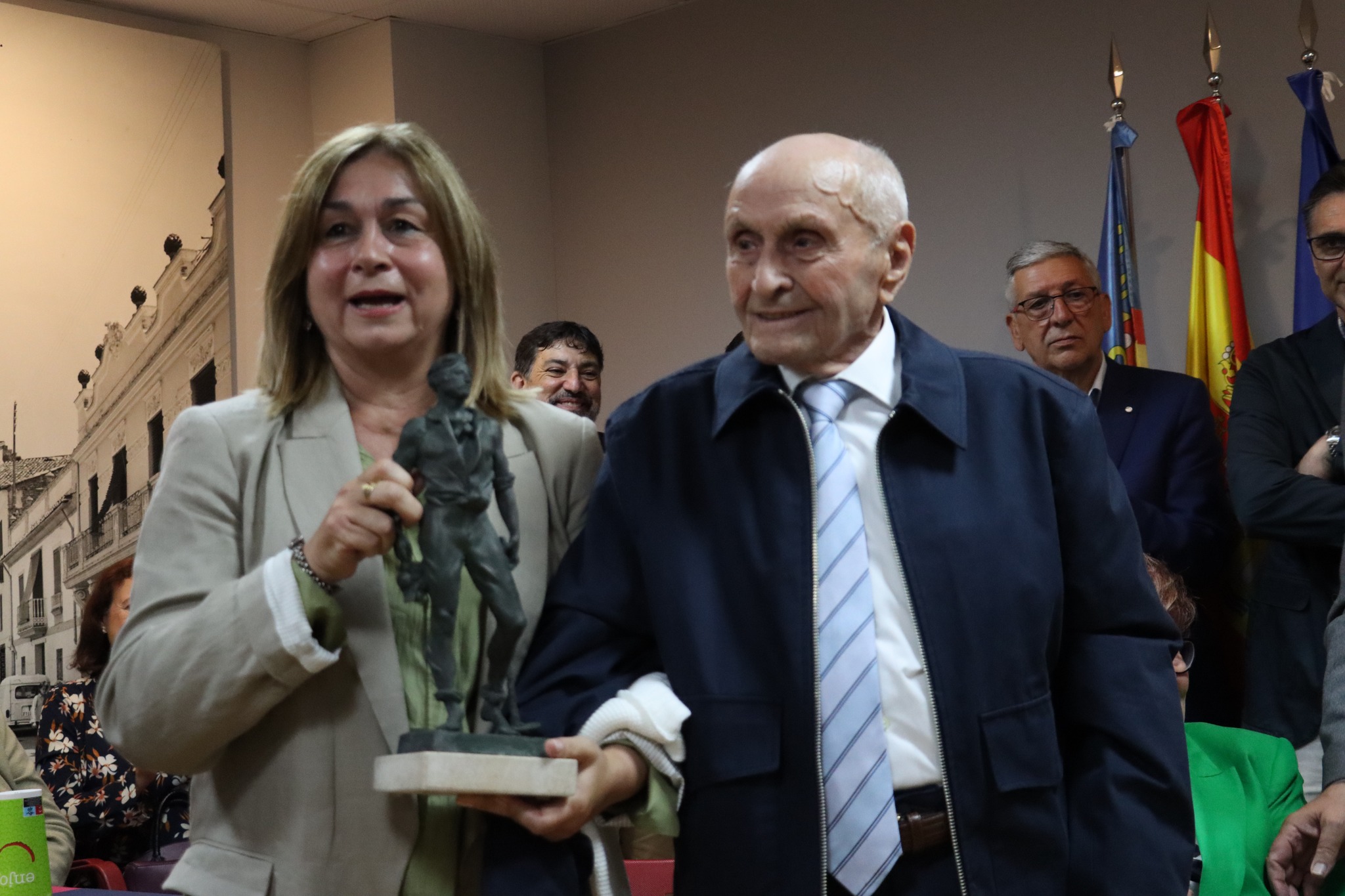 El momento más emotivo de la tarde llegó con la proyección del video homenaje a Benjamín preparado por el Ayuntamiento de Torrent, en el que su mujer, Regina Rumbeo, sus hijas, Regina, Mª Carmen, Chelo y Mónica, junto con sus nietos y nietas, repasaban la historia de Benjamín y los acontecimientos que marcaron su vida. Un atronador aplauso siguió a la proyección del vídeo, y entonces llegó el momento de hacer entrega del galardón a Benjamín, quien quiso agradecer el reconocimiento a todos los presentes.