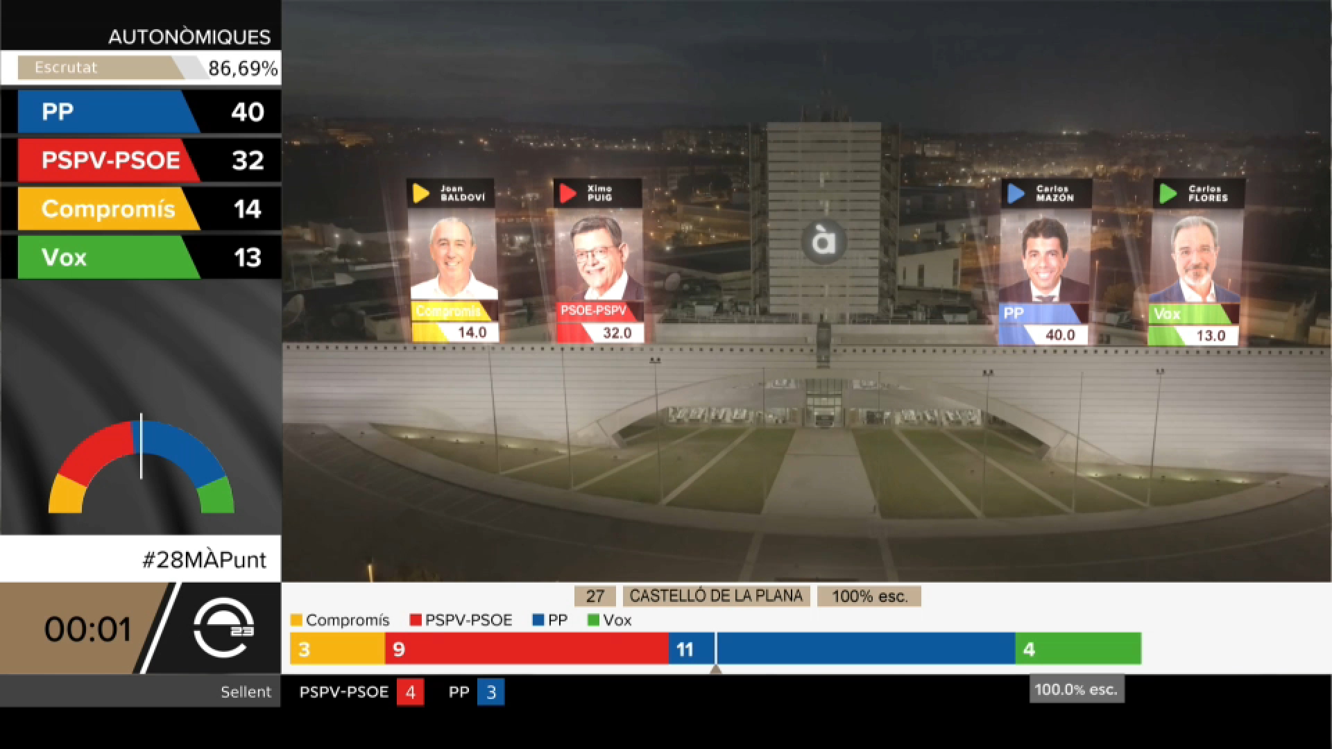 Fins a 799.000 espectadors passaren al menys un minut pel programa 28M: el resultatmentre que l’audiència mitjana d’este especial informatiu va ser de 218.000 espectadors amb un 11,7% de share. Esta xifra, en el global de la nit, deixa a À Punt a molt poca distància d’Antena 3 i supera el programa especial eleccions de La 1, des del prime time fins a la mitjanit.