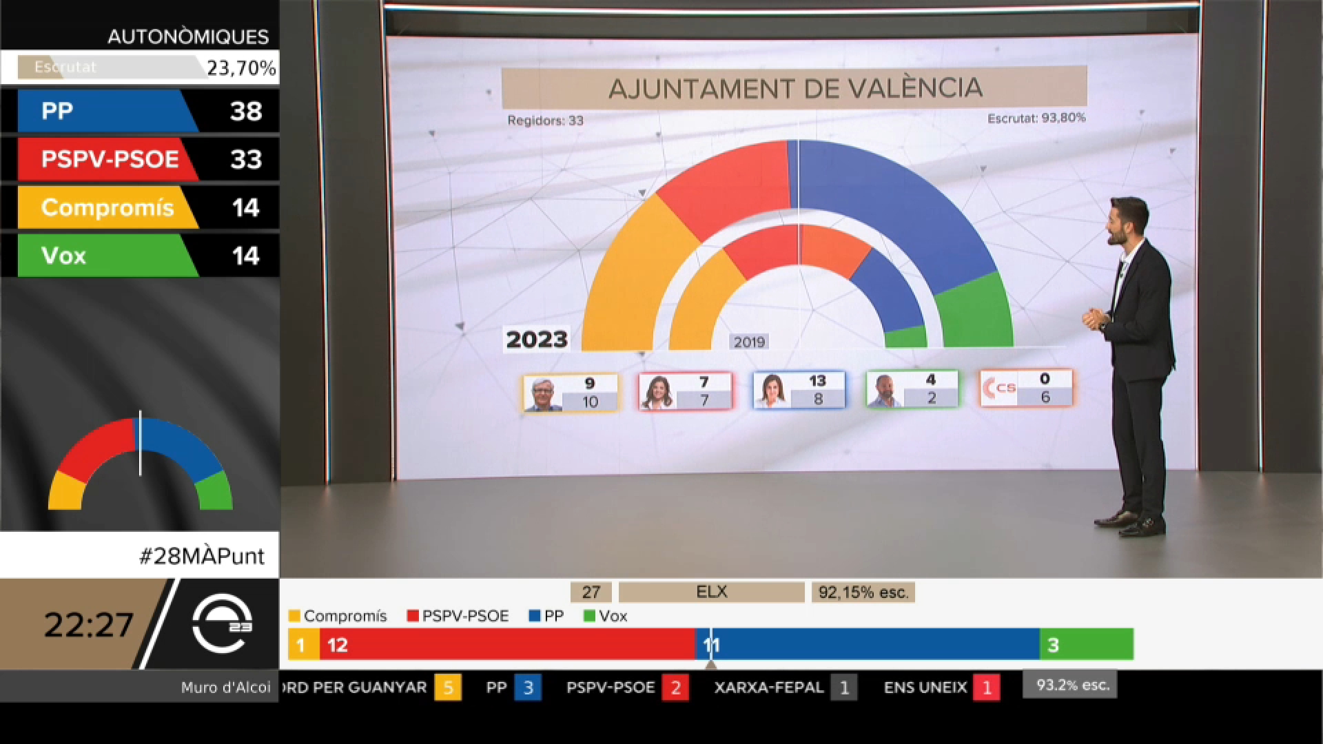 À Punt va oferir a les 20 h el primer dels esperats sondejos de les eleccions municipals i autonòmiques a les quatre ciutats principals amb les dades facilitades per la consultora d’investigació social i comunicació, GAD3. A partir de les 21:15, fins a la mitjanit, amb 28M: el resultat À Punt va desglossar per ciutats i pobles les dades electorals enriquides amb connexions en directe amb les diferents seus dels principals partits polítics. En acabar el programa 28M: l’anàlisi va continuar rebent el vist i plau del públic amb els experts (Susi Boix, Paola Cannata, Xavier Borràs i Alexis Lara) que analitzaren les diferents opcions del panorama polític valencià.