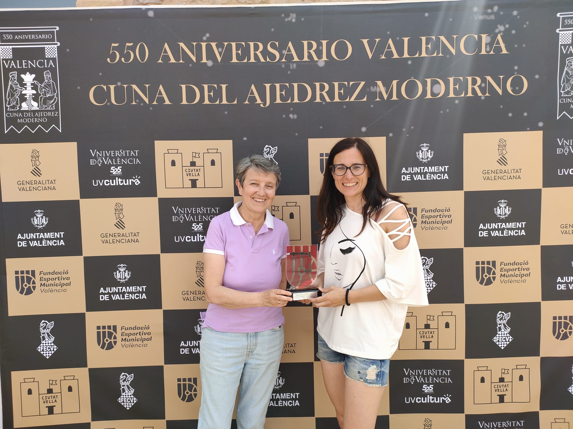 Detalle de la sesión. María Ángeles Vidal entregando una placa a Raquel Sales Cabe destacar la presencia de María Ángeles Vidal, directora gerente de la FDM, Basilio López, presidente de la Fundación Valencia Cuna del Ajedrez y José Antonio Garzón, investigador de la historia del ajedrez.
